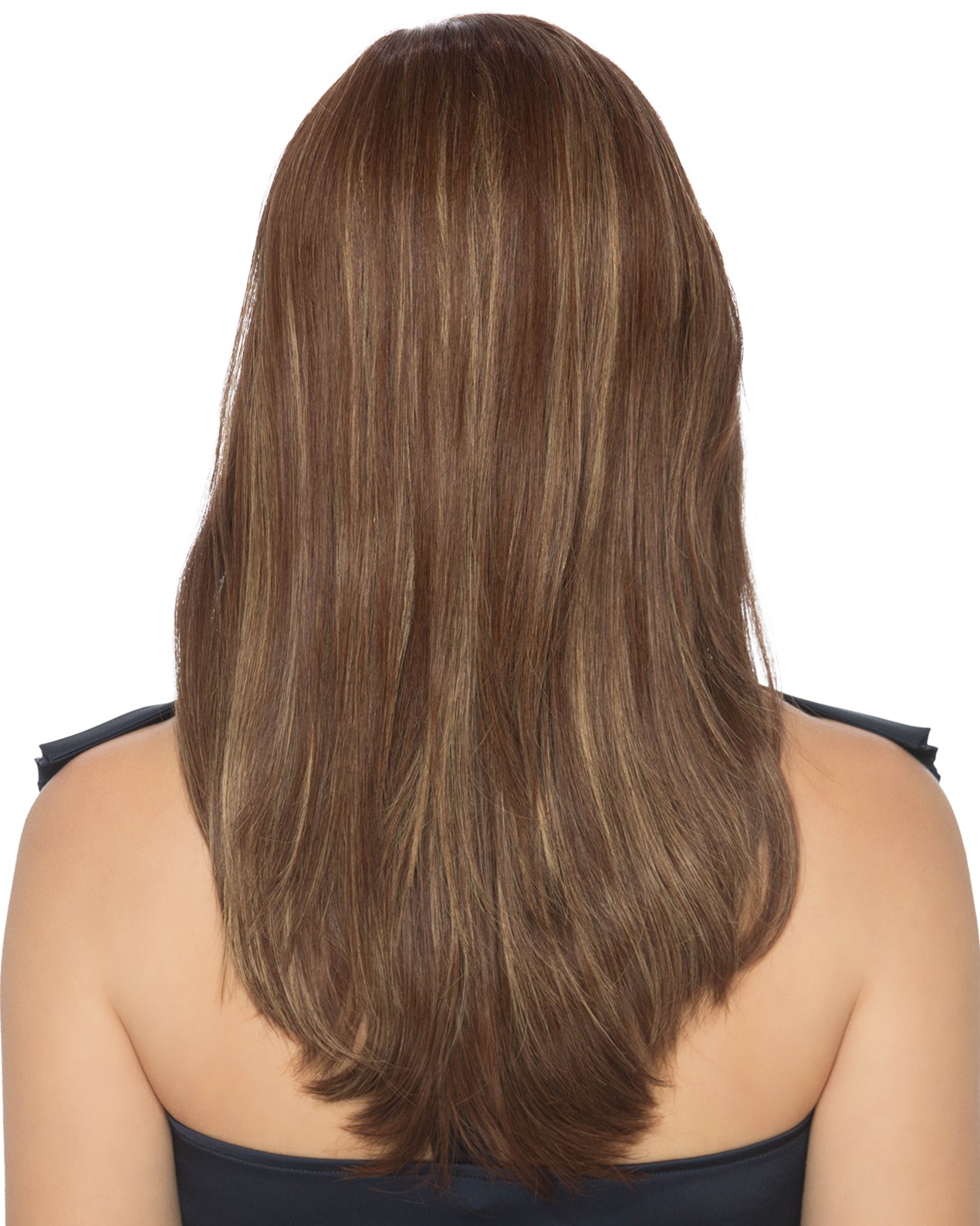 The Angelina is a mono top with machine made back wig. It is long semi-layered cut, made with 14" remy human hair.