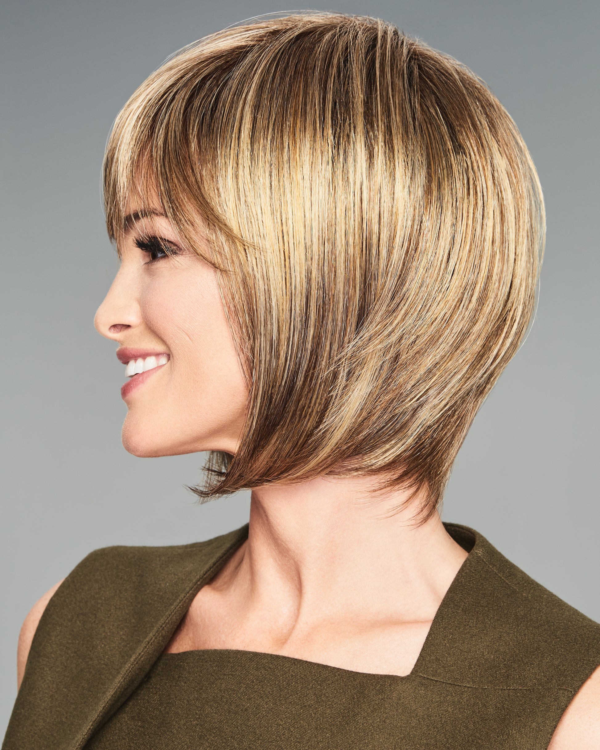 This chic sculpted shape with stacked layers at the nape and longer, disconnected face-framing layers at the sides is punctuated by a tapered fringe that is guaranteed to bring attention to the eyes.