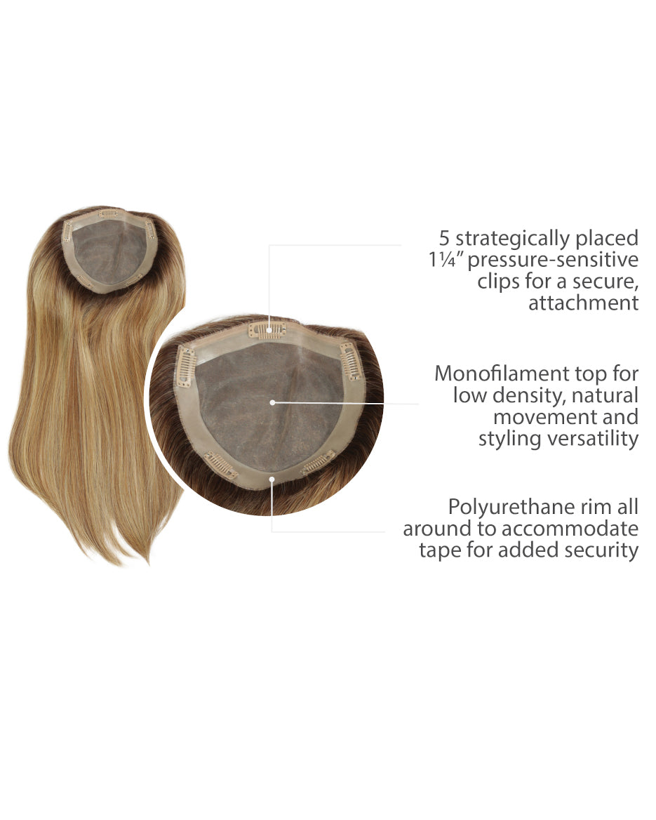 Offering the same construction as Gilded 18″, this human hair top piece is the perfect answer for women with longer length hair. An ample base conceals fine or thinning hair at the crown with extra volume and coverage to give you the long, full hair you've always wanted.