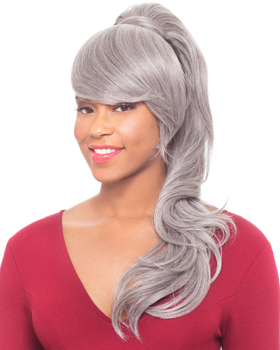 Duet 03 by Foxy Silver. A drawstring hairpiece with combs & clips to secure cap and bangs to your hair (bun).This piece has bangs and a ponytail