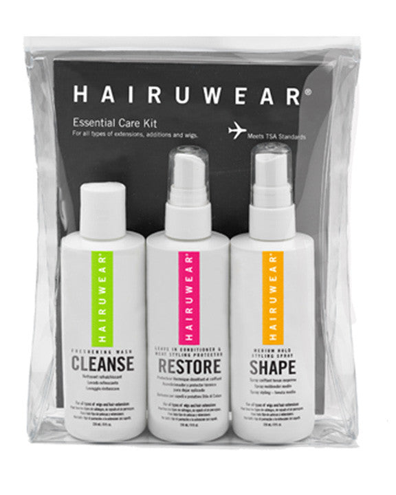 The HairUWear Essential Care Kit is the ideal size for the first time customer or traveler on the go to care for their wearable hair. The kit includes our 3 most popular wet line products in convenient 3.4 oz. bottles – Cleanse Shampoo, Restore Leave-in Conditioner & Detangler and Shape pump hair spray.