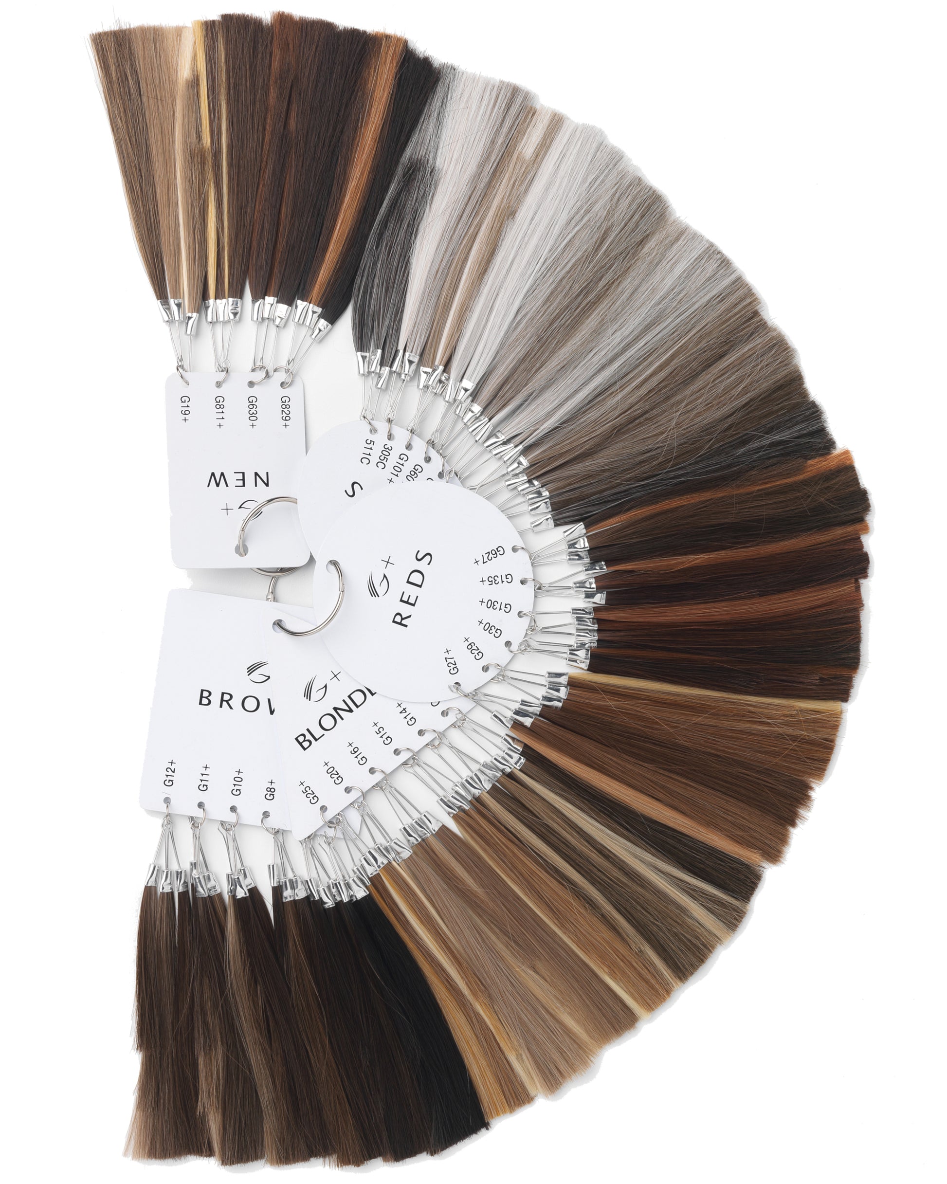 Eva Gabor G+ Color Ring includes colors: G2+ (Licorice Mist), G4+ (Dark Chocolate Mist), G6+ (Coffee Mist), G8+ (Chestnut Mist), G10+ (Nutmeg Mist), G11+ (Mocha Mist), G12+ (Pecan Mist), G13+ (Cappuccino Mist), G14+ (Almond Mist), G15+ (Buttered Toasted Mist), G16+ (Honey Mist), G17+ (Vanilla Mist), G19+ (Praline Mist), G20+ (Wheat Mist), G27+ (Ginger Mist), G29+ (Cayenne Mist), G30+ (Paprika Mist), G31+ (Mango Mist), G38+ (Sugar Walnut), G48+ (Sugared Pecan), G56+ (Sugared Silver), G58+ (Sugared Almond), G60+ (Burnished Snow), G101+ (Platinum Mist), 305C (Sugared Smoke), 511C (Sugared Charcoal), G630+ (Chocolate Copper Mist), G829+ (Dark Cinnamon Mist), and G811+ (Mahogany Mist).