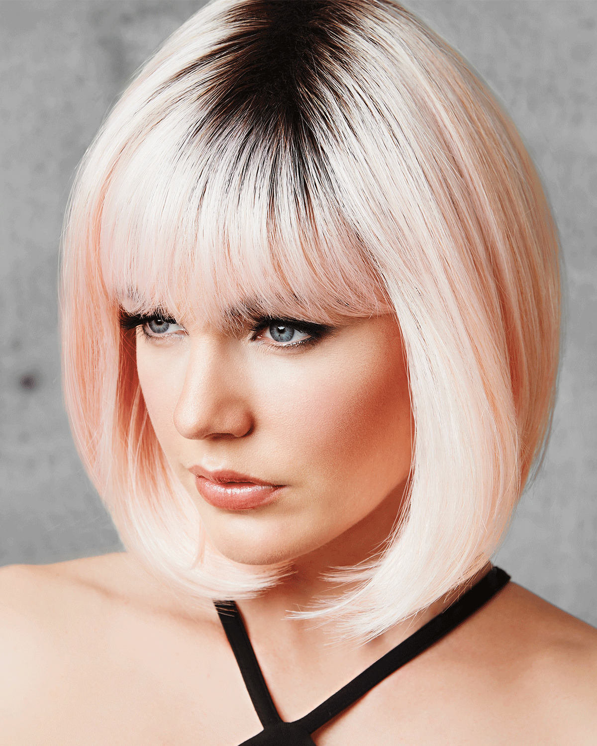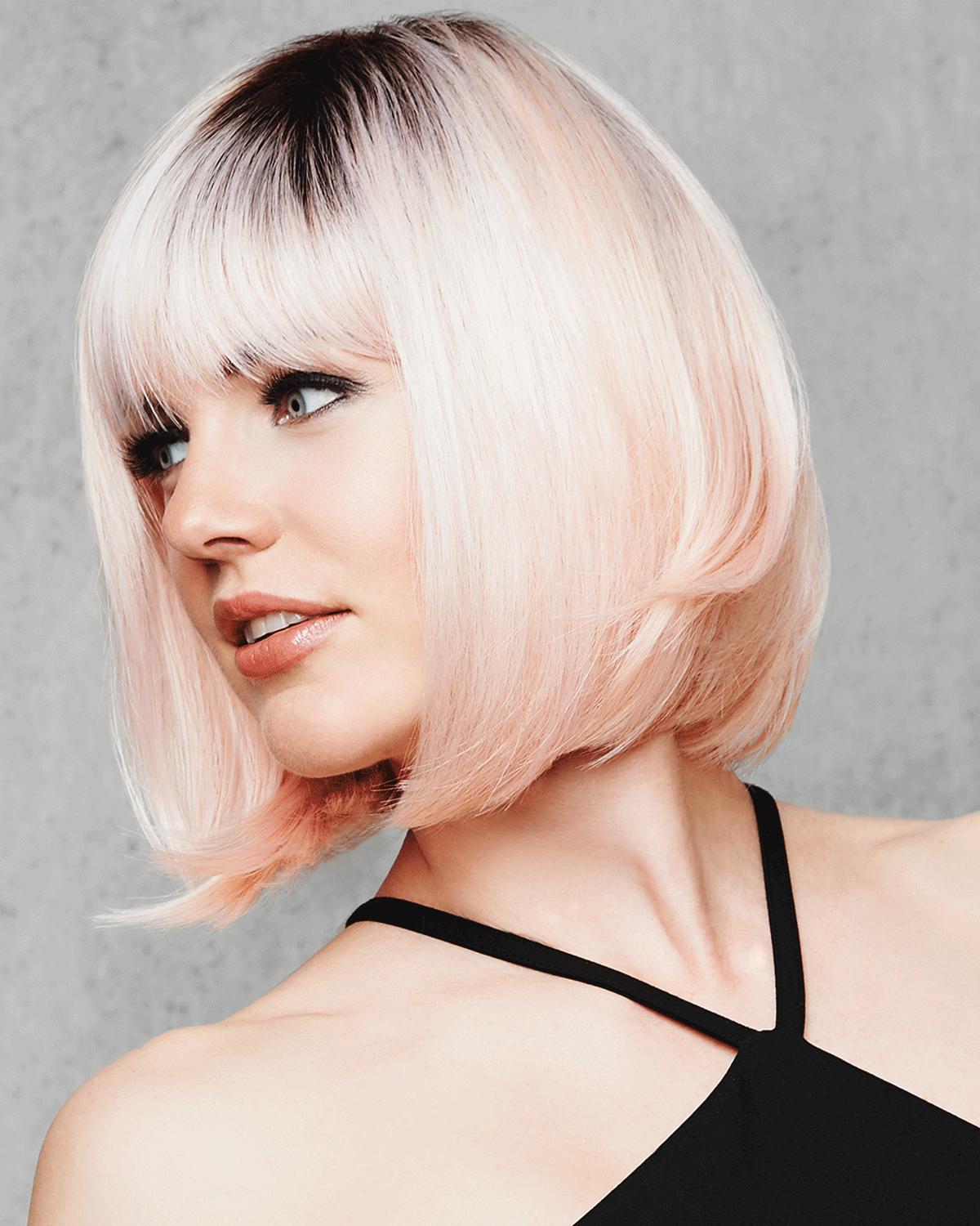 Peachy Keen by HairDo. The perfect shade of peachy pink can now be yours without commitment. This pastel color trend is paired with a bob cut, making it classic yet edgy. The multi-faceted color has a darker root to add contrast and a natural look. Have your hairstylist customize the bang and style the Tru2Life® heat-friendly synthetic hair with a curling iron or flat iron. The cap is made to be light and as cool as you.