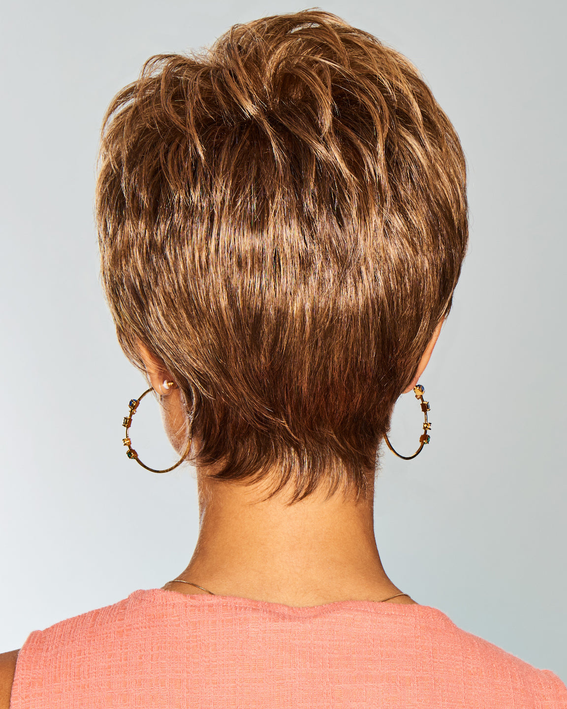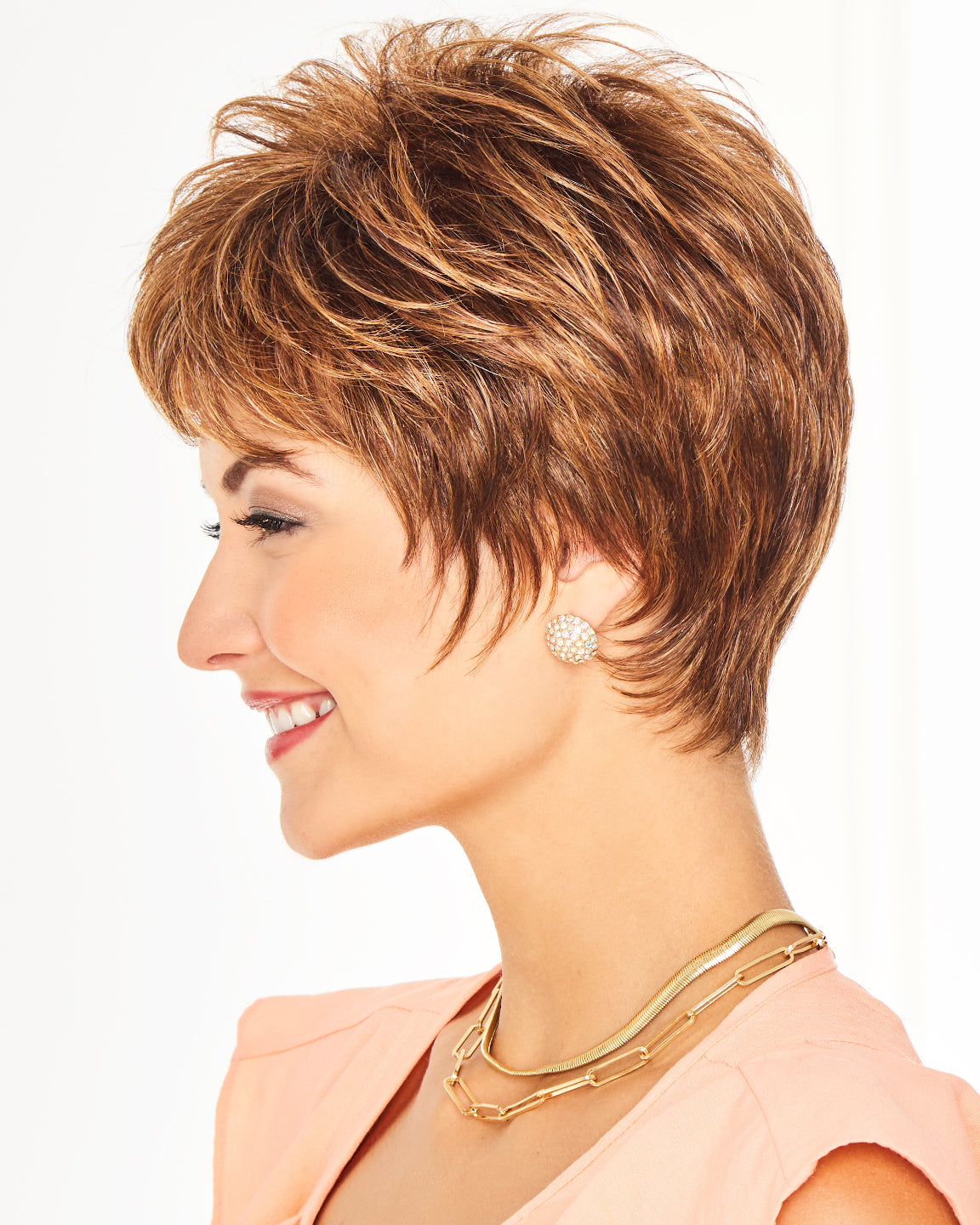 A short and sassy silhouette with a thoroughly modern, gently sculpted wave texture. Its air of polished sophistication comes from the delicate details: a short bang, professionally tapered lengths at the nape, and enough soft texture to frame the face or tuck behind the ears.