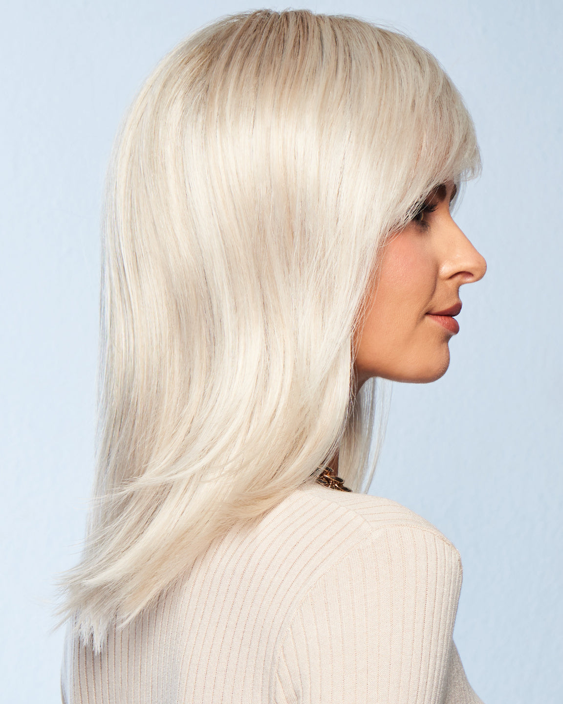 A slightly angled bang and light layering along the neckline give a soft edge to this blunt cut, one-length style. Available in two sizes.