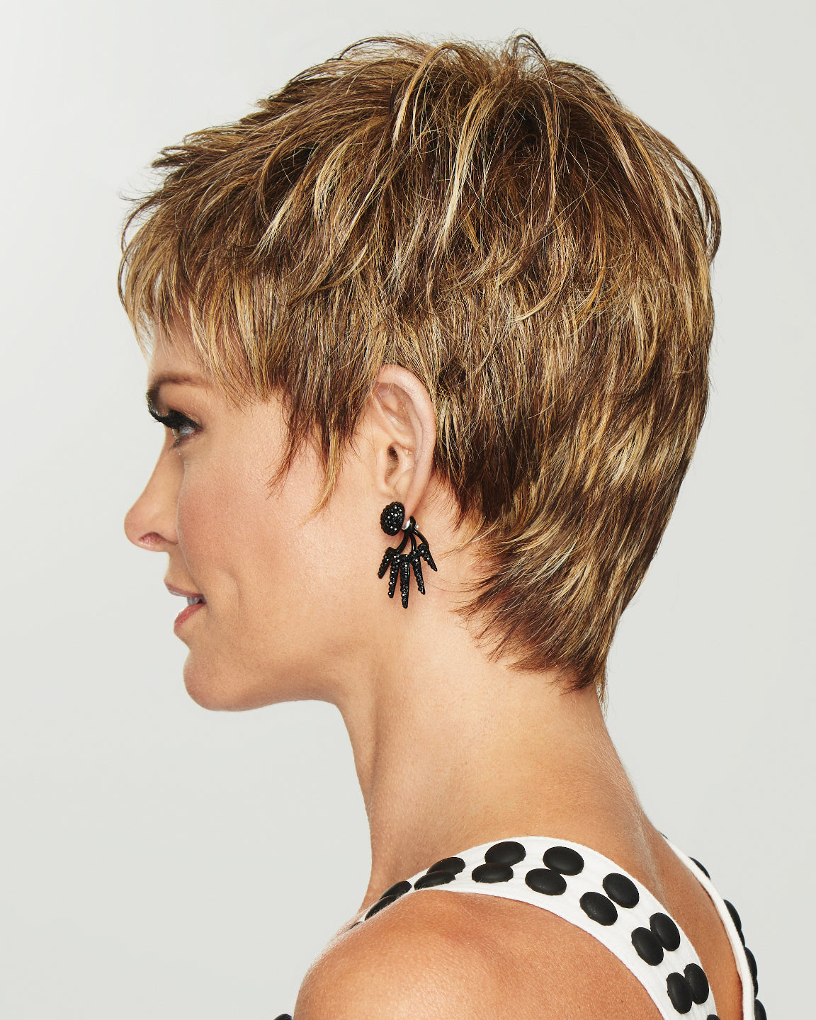Offering a light, cool fit with no-fuss styling, this short, slightly textured boy cut includes a barely curled top and crown, wispy, feathered bangs and expertly layered sides and back that blend into a neck hugging nape.