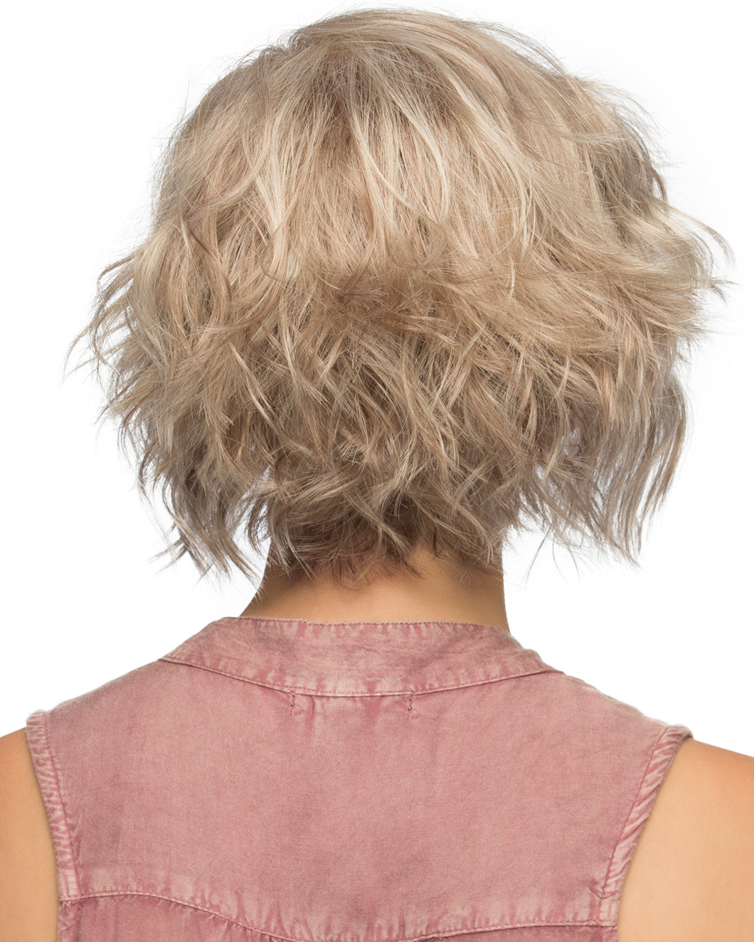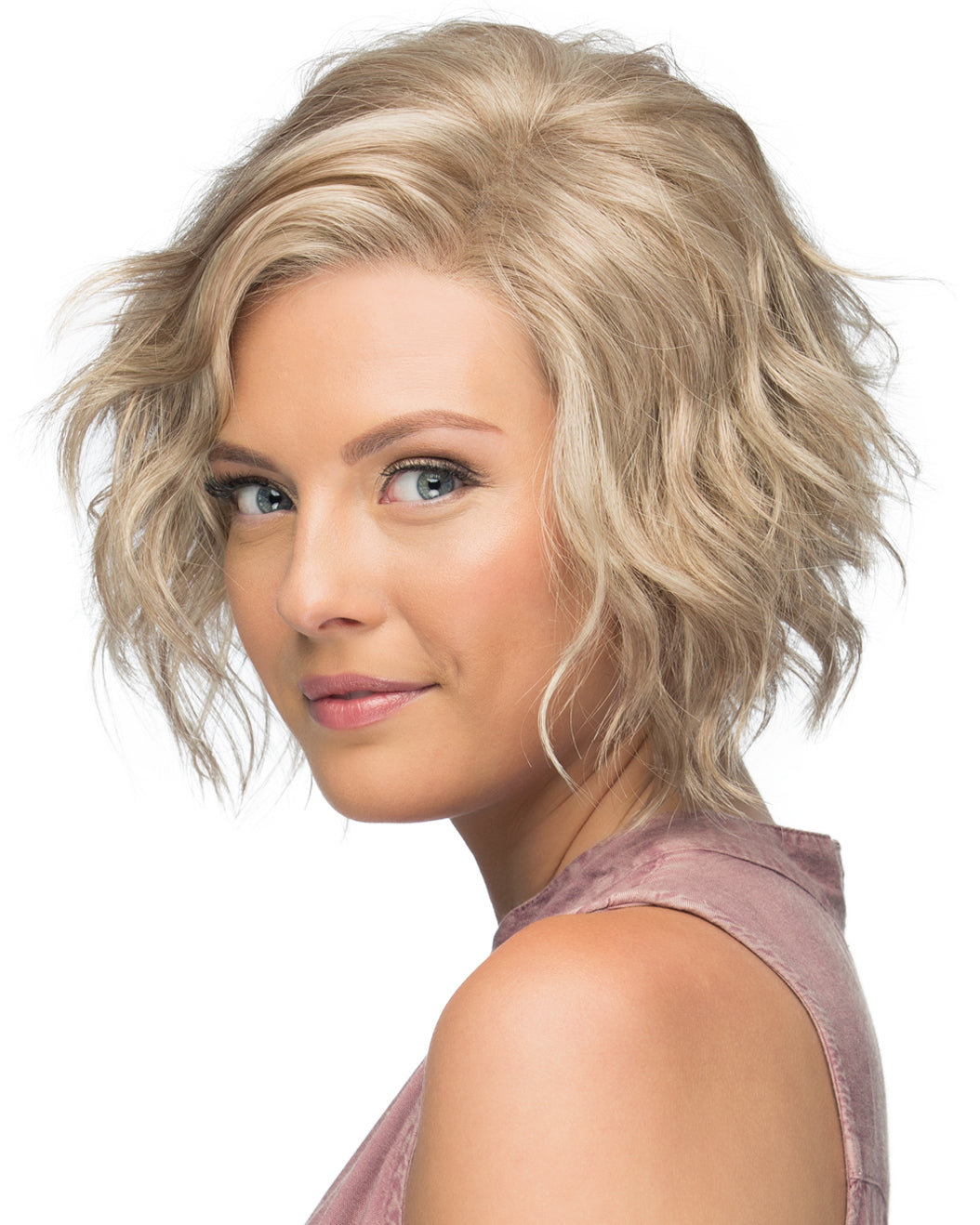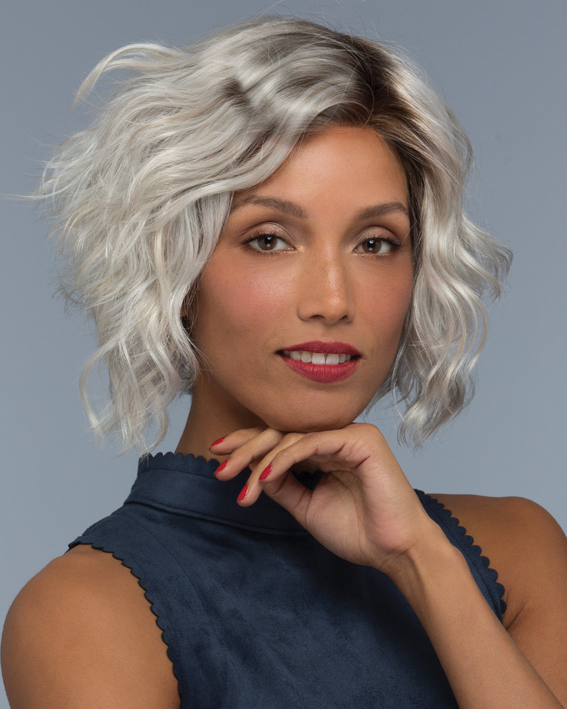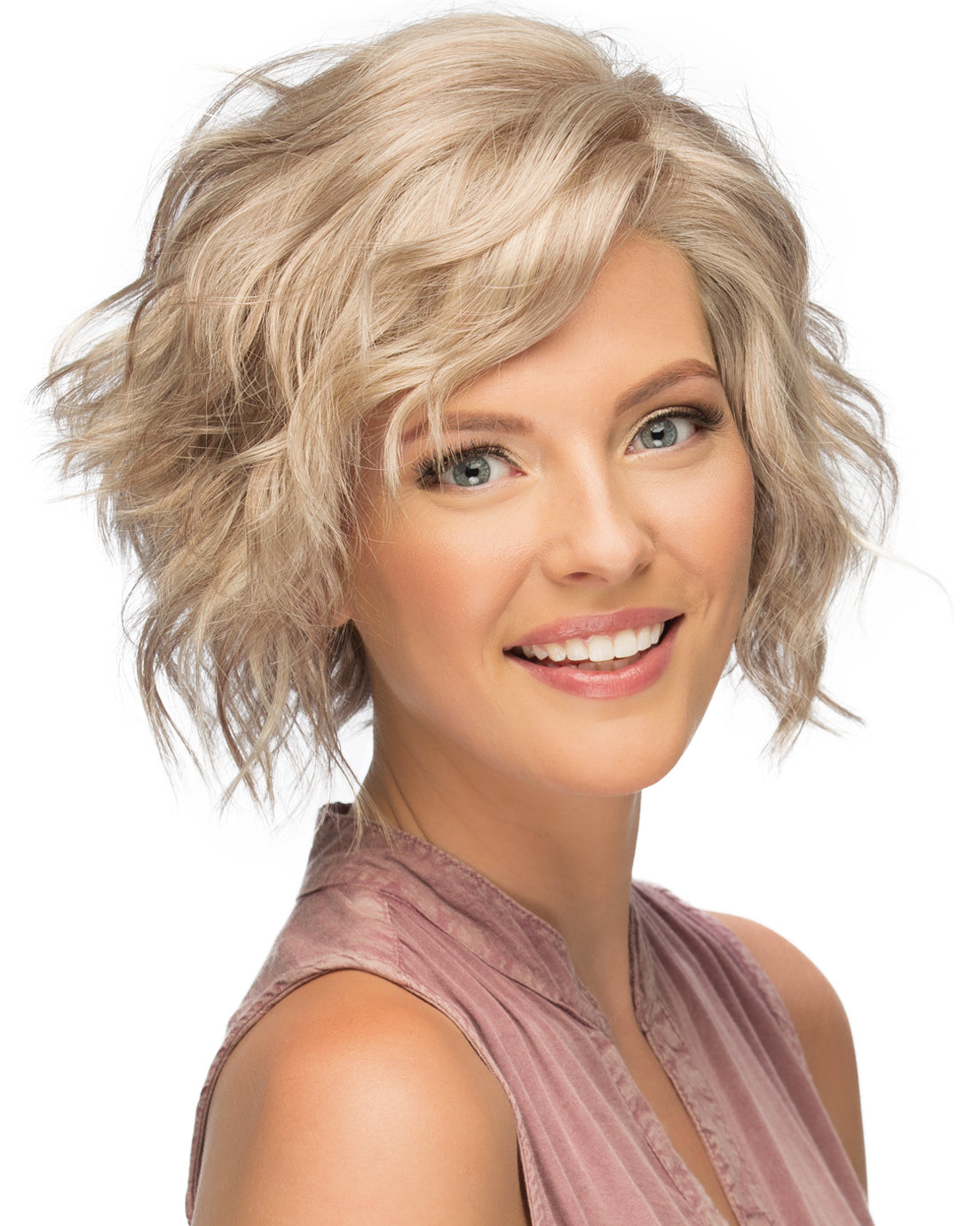Wynter by Estetica Designs is a short, angled cut bob with long side swept bangs. Texturized waves are paired with choppy layers for an edgy, chic look.